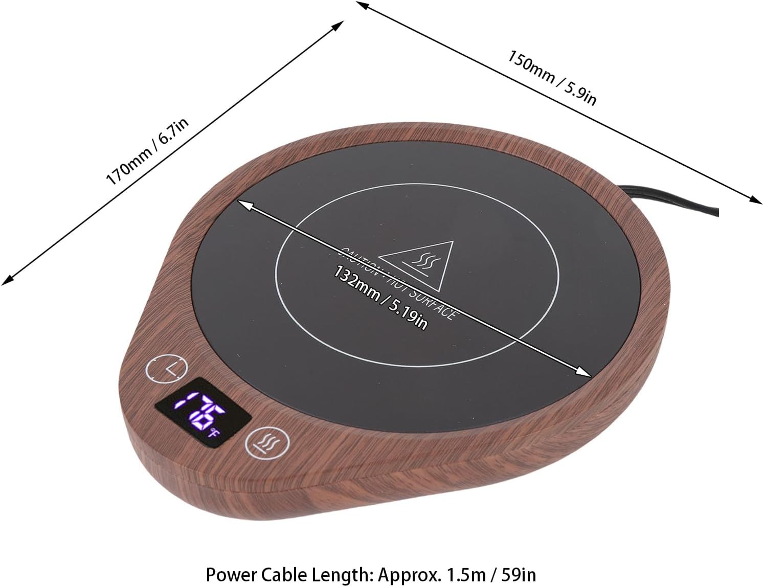 Spec: Item Type: Mug Warmer Material: PC Power: 36W Heating Temperature: 130℉-176℉ Auto Shutdown: Default 4H (Customizable 2-12H) Power Cable Length: Approx. 1.5m / 59in Heating Plate Diameter: Approx. 13.2cm / 5.19in Weight: Approx. 464.00g / 16.37oz How to Use: Follow the instruction manual for use. PackageList: 1 x Mug Warmer 1 x User Manual