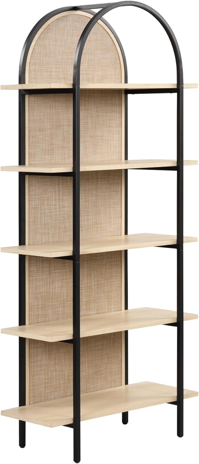 Introducing the Amara etagere bookcase -- a captivating blend of boho elegance that will sweep you off your feet! This 5-shelf bookcase boasts a sleek metal frame adorned with arch top design, all rendered in a chic matte black finish. The shelves are the perfect spots to display your books, photos, and favorite home decor. The open bookshelf has a back panel made from durable textiline rattan, effortlessly infusing your room with the perfect amount of bohemian ambiance. Perfectly crafted for function and style, our Amara rattan bookcase is the solution to your home's storage and visual upgrade. Nathan James is the furniture company built for this generation. You don't need to spend a fortune to get quality design-first furniture and when we say easy assembly, we mean it. Our guarantee is our word. Your purchase is backed by a 100% money-back guarantee. If you have any quality issues just contact us and we will send you a replacement immediately, no questions asked. This product is not recommended for commercial use Materials: - Matte Black PC Metal - Light Oak Particleboard with Paper Laminate - Textiline Rattan Assembly Must-Haves: -Packaging Carton as working surface -Phillips head screwdriver Weight Limit: 55 lbs per shelf