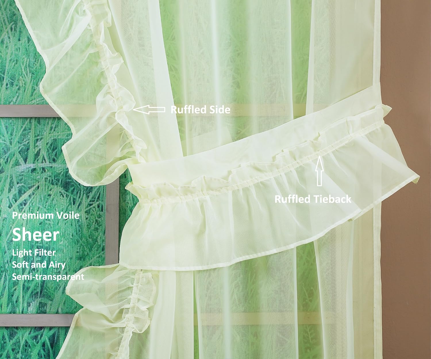 This 5-Piece-Set is a complete set for a window, which contains 2 ruffled panels, 2 ruffled tiebacks, and a ruffled valance attached on the top. A perfect for light filter, Semi-transparent, soft and air. Use 1.5” rod pocket. 100% polyester. Easy care, machine washable. Each unit sold separately.